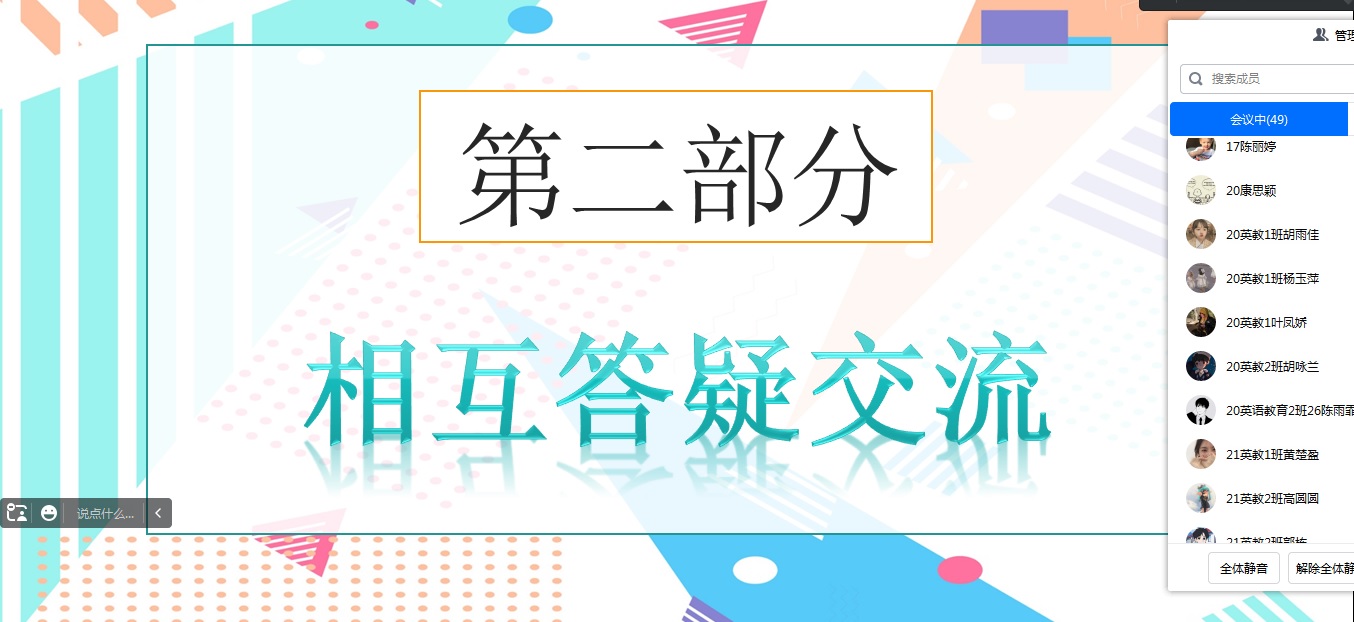 本次座谈会主要分为实习经验交流和互动答疑两个环节。首先,由20级各小学的实习队长就自己前往的实习地点及实习任务进行简要介绍,然后分享自己的实习体验。接下来是提问环节,21级学生代表向他们的学姐学长以及实习带队老师进行了事无巨细的提问。双方有问有答,座谈会气氛很是热烈。