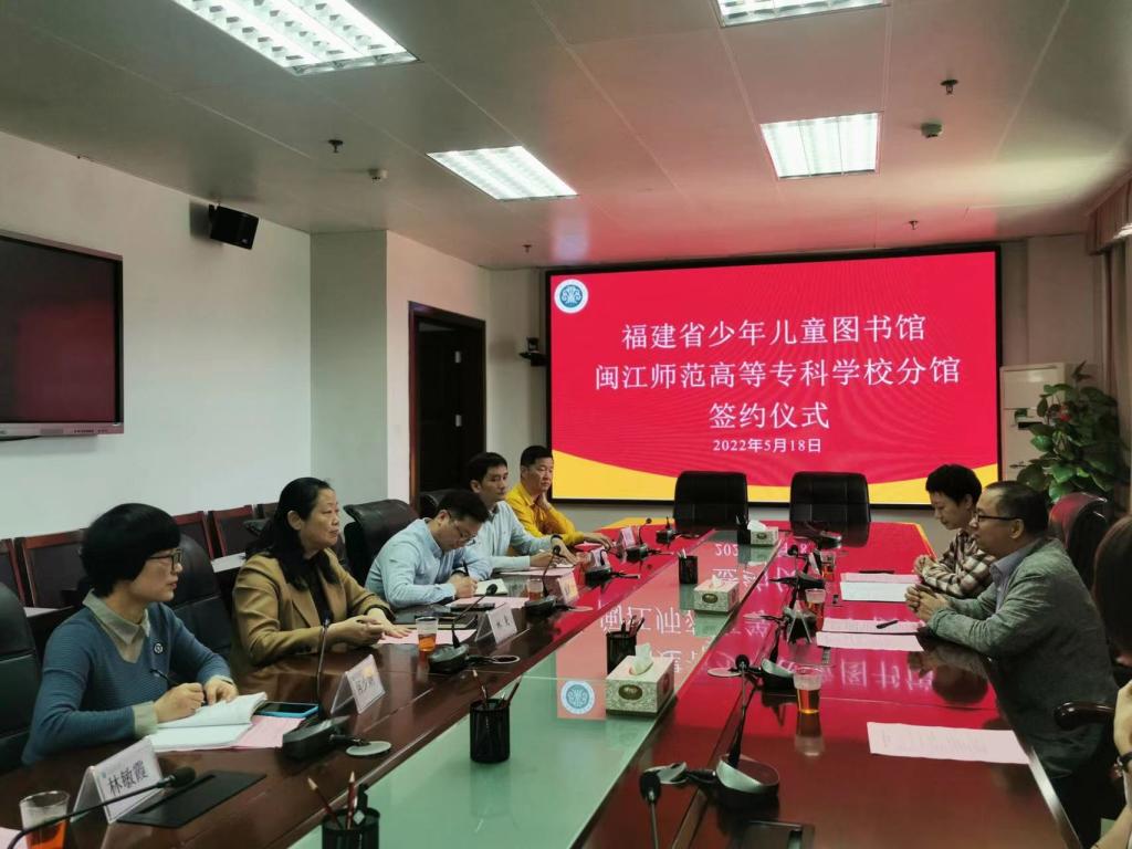 5月18日上午,闽江师专外语商贸学院与福建省少年儿童图书馆于第一会议室举行分馆签约暨授牌仪式,福建少儿图书馆馆长郑卫光、大赢家体育app下载副校长林旻、团委副书记王海波、外语商贸学院党总支副书记(主持)林冉、院长何少娴参加了本次签约暨授牌仪式。