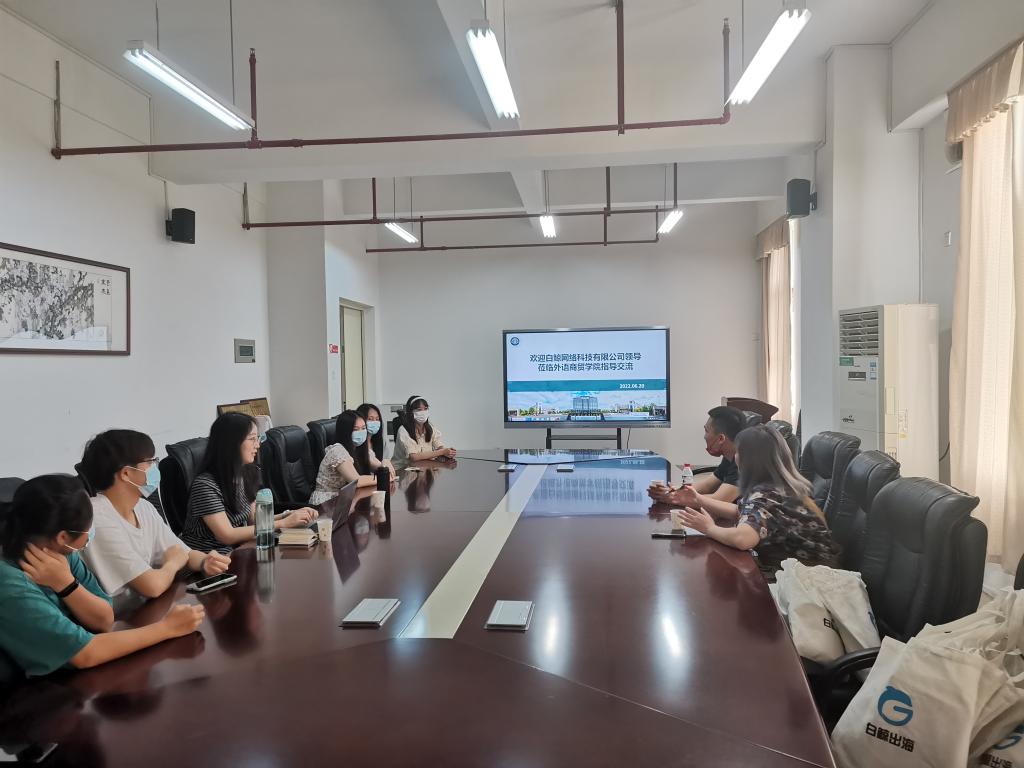 2022年6月21日,白鲸网络科技有限公司电商部负责人和人事经理一行来到外语商贸学院洽谈校企合作,应用外语专业林超老师、金曦老师以及部分20级马来语同学参加了交流座谈会。