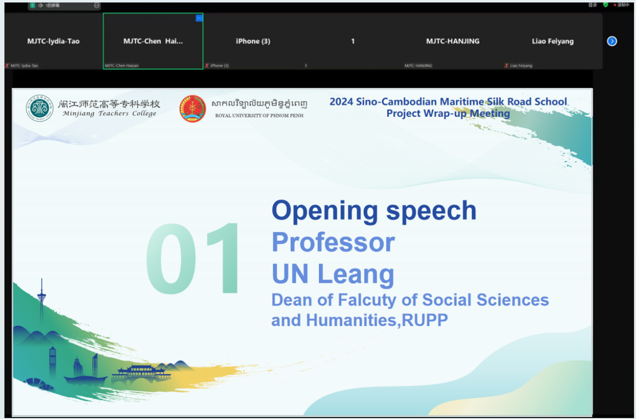 会议在“海丝学院”中、柬、英三语视频中拉开序幕,以师生共唱一首歌形式,回顾柬埔寨金边皇家大学项目学生来闽交流的精彩瞬间,重现在外语商贸学院的精心组织安排下,柬埔寨学生在中国的学习生活、文化交流和企业参访场景,展现中柬青年学生之间深厚的友谊。