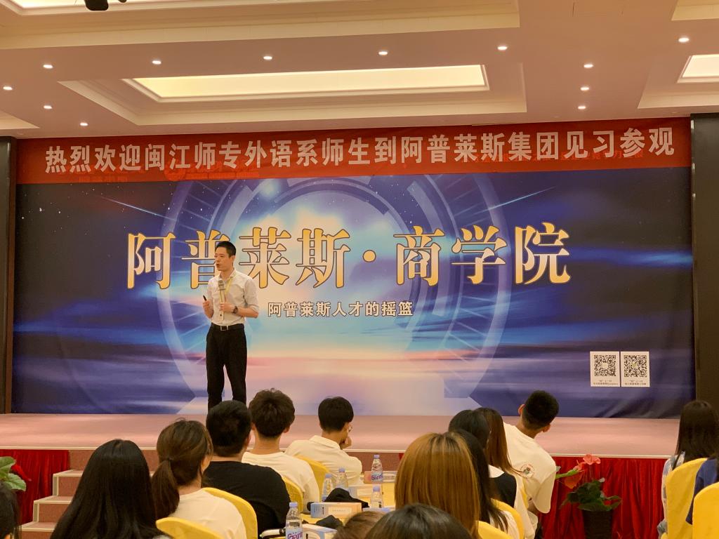集团人资团队对同学们的到来表示了热烈的欢迎。在向大家介绍了阿普莱斯集团的基本情况后,带领同学们先后参观了阿普莱斯创业园、集团办公楼和生产车间。最后,阿普莱斯集团·商学院金牌讲师、阿里巴巴特聘讲师陈钦做了题为《破茧成蝶,把握未来》的讲座,为同学们深入浅出地分析现今就业形势及外贸业务员岗位职责。他认为,年轻人更应该找准自己的定位,选择好自己的第一份工作,进而努力、深耕,找到自己的不可替代性,最后企业发展与自身成长相结合,与企业共同成长。