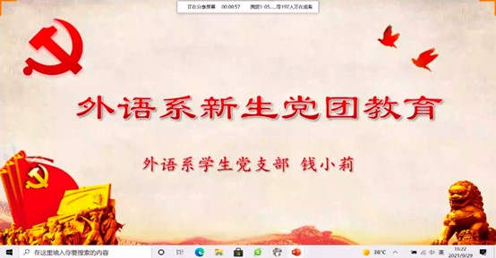 为加强党团建设,提升大赢家体育app下载学生的“敬党爱党”精神,增强大学生的党团意识,强化大学生思想政治教育,外语系于2021年9月29日下午16:00通过线上会议形式开展外语系新生党团教育,此次会议由外语系学生党支部书记兼团委书记钱小莉主讲,外语系21级全体新生参加。