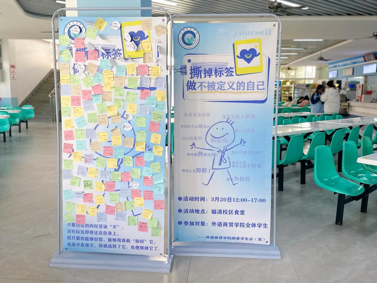 为了帮助同学们提高心理素质,营造良好的校园心理文化氛围,外语商贸学院于2024年3月20日在旗山校区教学楼3-1018门口以及福清校区食堂开展以“撕掉标签,释放自我”为主题的心理健康活动。