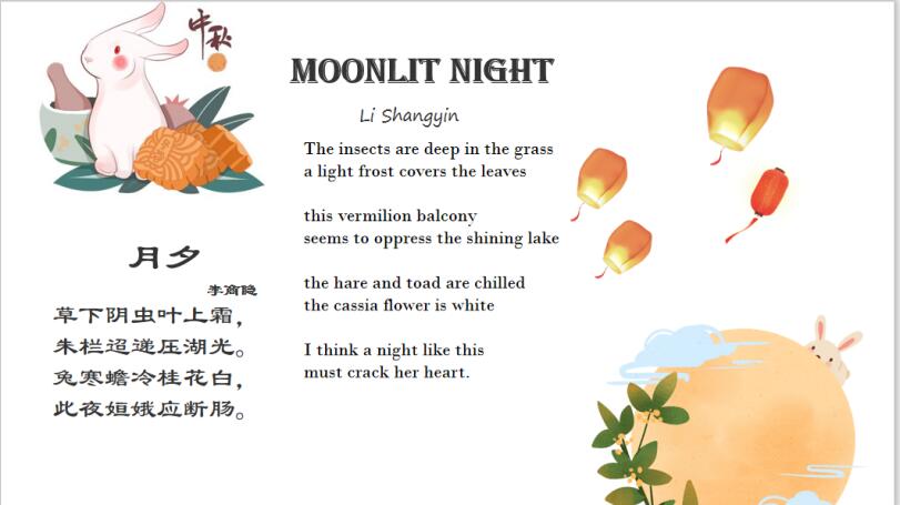 作为一名中国人,更作为一名新时代大学生,充分了解我国的传统节日是很有必要的。因此,活动一开始,主持人先随机抽选一名幸运同学来讲述中秋节的历史,此举加深了大家对中国传统文化的了解,激发同学们深刻的爱国情怀。接着,主持人又向大家分享了一首中外版的《月夕》,这是我国古代著名诗人李商隐的诗,后又由热心网友用英语翻译出来,中外文化的有趣碰撞,十分彰显大赢家体育app下载外语系的特色,激发学生浓厚的学习兴趣。