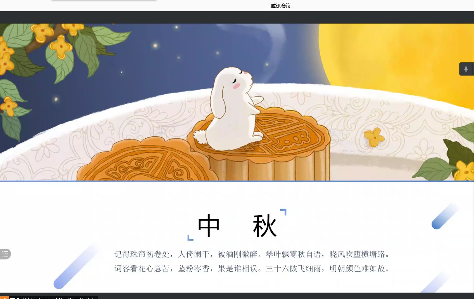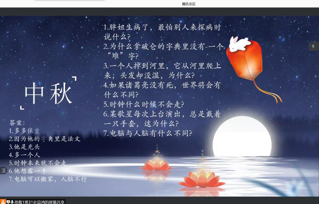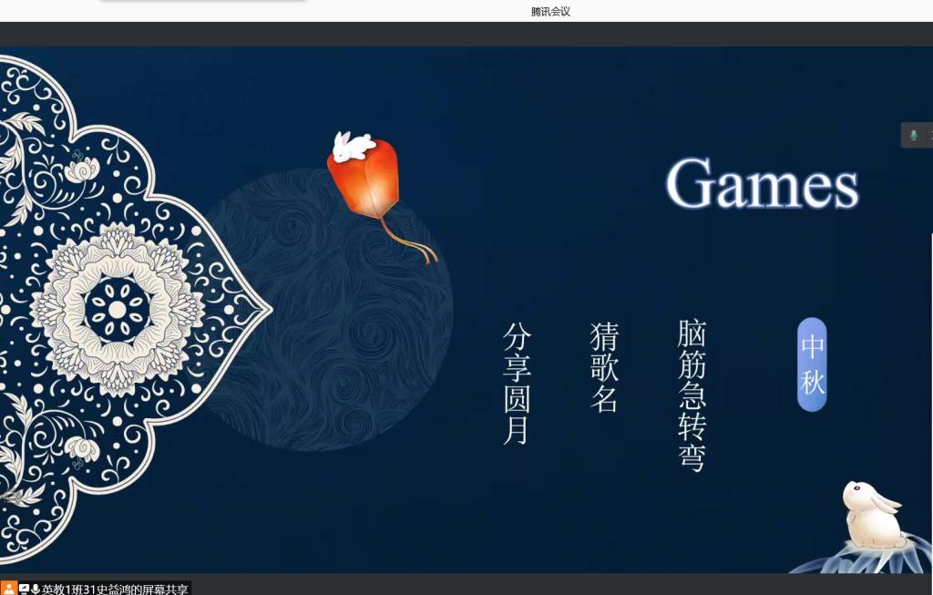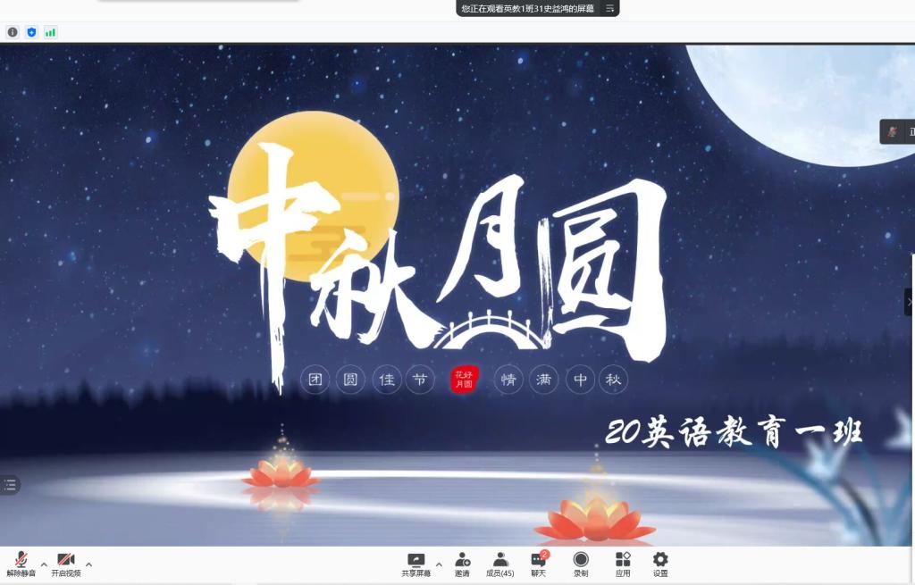 金秋送爽,丹桂飘香,又迎来了一年一度的中华民族传统节日——中秋节。为了使同学们过一个温馨快乐的中秋节,进一步弘扬中华传统文化的魅力,外语系英语教育一班于2021年9月21日晚七点,在线上同学们开展了温暖有趣的中秋活动,让同学们身处学校也能够感受到家庭的温暖。