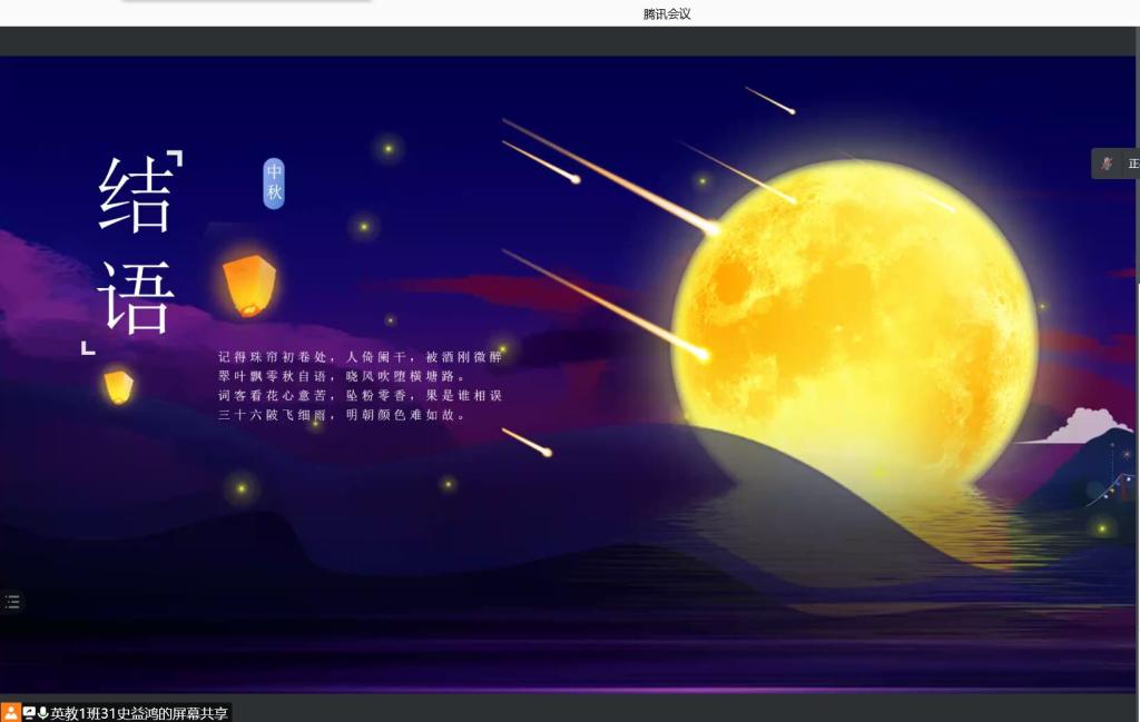 活动最后,班长史*鸿再次为同学们送上中秋祝福,并提醒同学们在疫情期间注意好防护,有好的身体才能更好的学习,中秋之夜,就在这一片其乐融融中度过。