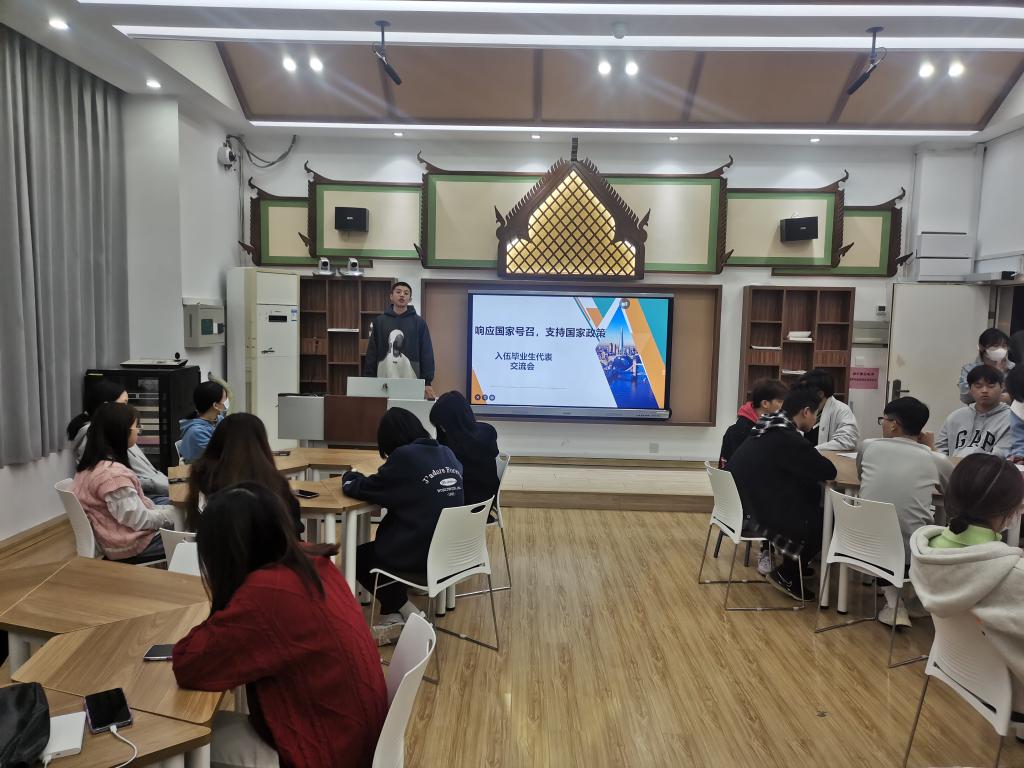 响应祖国召唤参军入伍,化爱国之心为报国之行!2021年11月10日,外语系应用外语专业由李绍梅老师主持举办了一场“响应国家号召,支持国家政策——入伍毕业生代表交流会”,邀请了18级应用外语(柬埔寨语)专业黄学成作为入伍毕业生代表,向应用外语专业对入伍感兴趣的同学们分享他的国防青春故事。