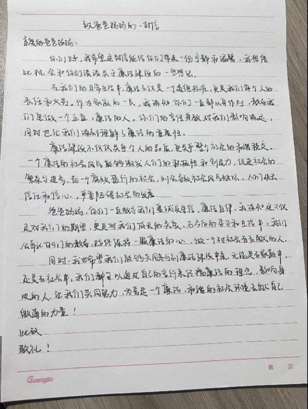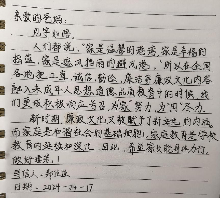 “家风不染尘,清廉润闽师”。家庭是人生的第一课堂,父母是孩子的第一任老师,好的家风才能支撑起好的社风、政风。我院为推动廉洁教育家校共行,倡导学生通过书信方式向父母传递廉洁的价值观念,通过家庭渗透,让学生与父母共同树立廉洁自律的家庭氛围,提高家庭成员对廉洁重要性的认知。