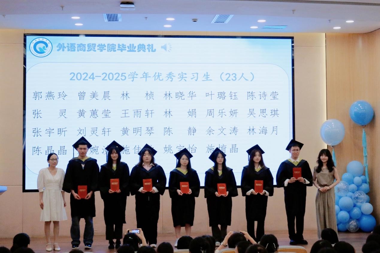 国歌奏响,全体起立。毕业典礼正式开始。首先,卢燕红副书记宣读2025届三好学生、优秀学生干部、优秀共青团员、优秀志愿者、优秀实习生获得者名单,并与刘诗雨副院长共同为获奖学生代表颁发荣誉证书。接着,陈海燕副院长宣布外语商贸学院2025届毕业生毕业决定;何少娴院长为毕业生代表颁发毕业证书。然后,林锦芯书记宣读外语商贸学院2025届优秀毕业生表彰名单,为他们颁发荣誉证书,祝愿他们带着这份荣誉赋予的勇气和信念,在人生新征程上继续书写属于自己的辉煌篇章。