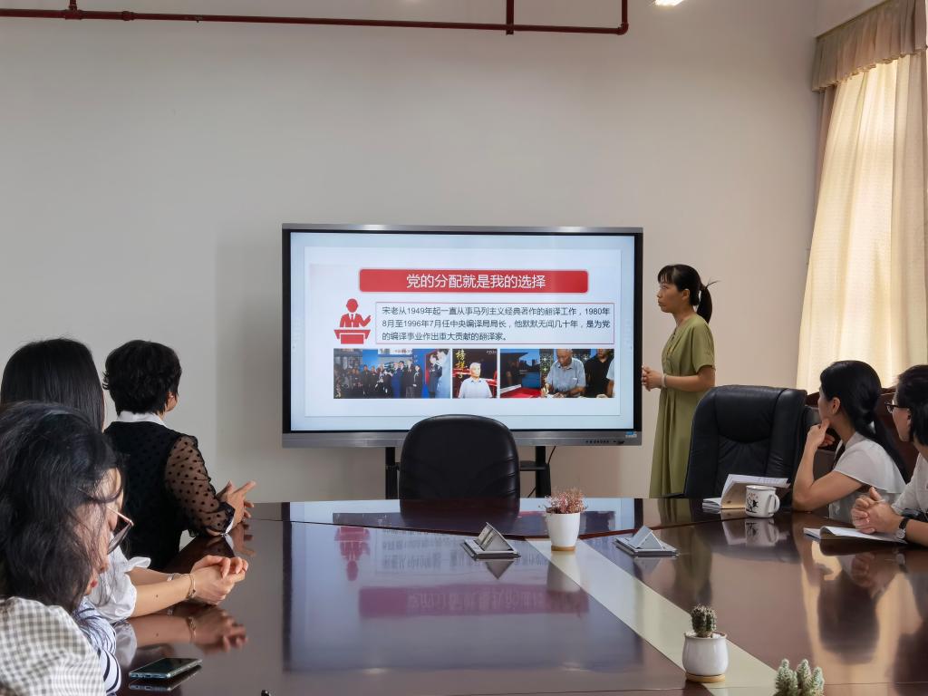 会上,首先陈虹同志先领着大家学习了习近平同志在《求是》杂志上发表的文章《用好红色资源传承好红色基因把红色江山世世代代传下去》、习近平总书记向世界马克思主义政党理论研讨会致贺信精神及福建省纪委监委通报4起群众身边腐败和不正之风问题典型案例。教育党员教师要铭记革命历史、在传承革命传统。接下来,陈虹同志开展了第二期“红色外语”之“献礼建党100周年”系列微党课,主题为“毕生坚守有‘书声’——宋书声的故事”。宋书声同志中华人民共和国成立以来一直从事马列主义经典著作的翻译工作,为党的编译事业作出重大贡献。他的“甘为真理付韶光”让党员同志们深受感动。