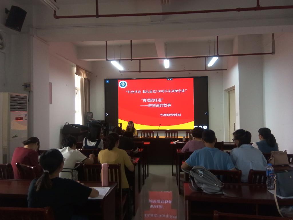 2021年5月20日下午,外语系教师支部在行政楼8楼党员活动会议室召开5月理论学习和“红色外语”之“建党100周年”系列微党课学习。本次理论学习和微党课活动均由支部书记何凌同志主持。