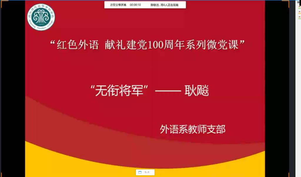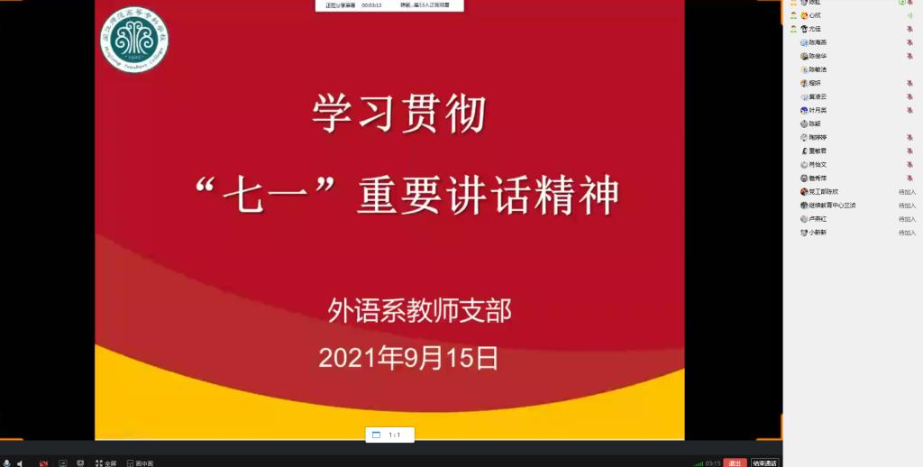 2021年9月15日下午,外语系教师支部于线上开展召开9月份理论学习和“红色外语”之“建党100周年”系列微党课学习。