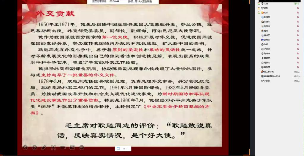 随后,尤佳同志开讲了第三期“红色外语”之“献礼建党100周年”系列微党课,主题为“‘无衔将军’——耿飚”。耿飚同志在前半生领导游击队配合红军作战,并参加四渡赤水、再克遵义、南渡乌江,从云南境内巧渡金沙江等重要战役战斗;而后半生其前往外交部工作,长达20多年,为新中国的外交事业做出巨大贡献。