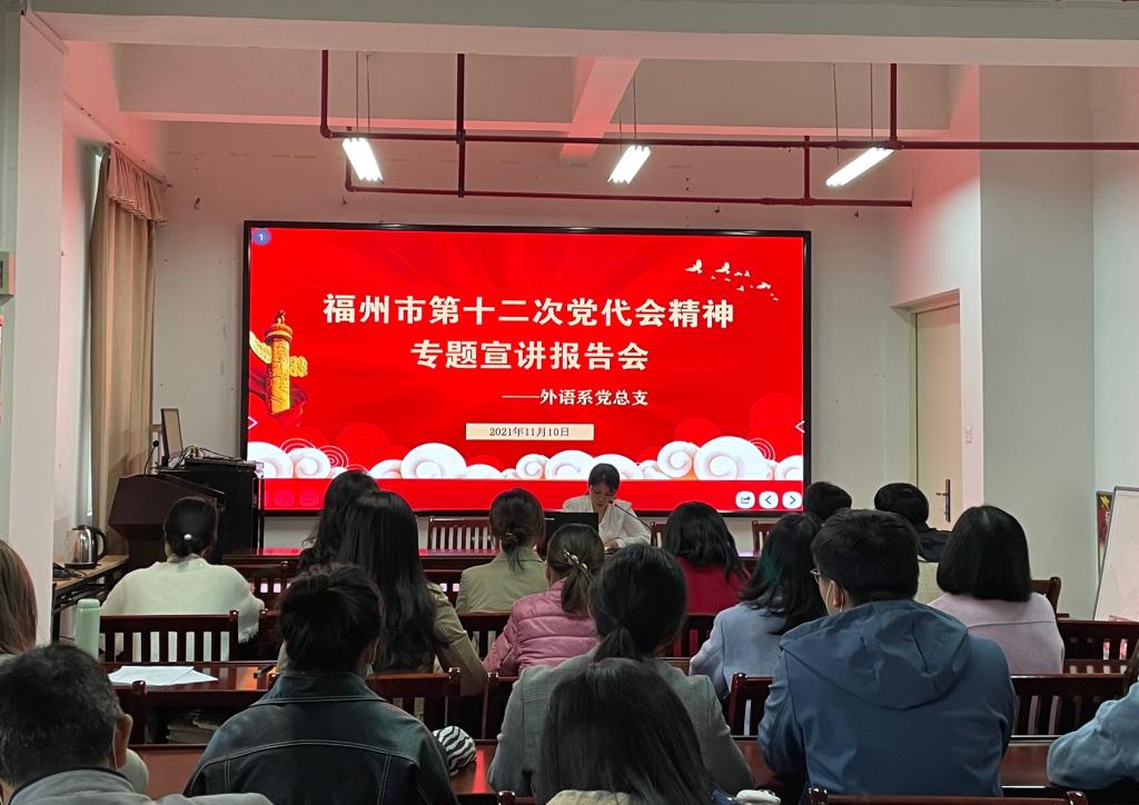 2021年11月10日下午,外语系党总支召开福州市第十二次党代会精神宣讲会,系党总支书记兰浈面向全系党员教师开展宣讲。