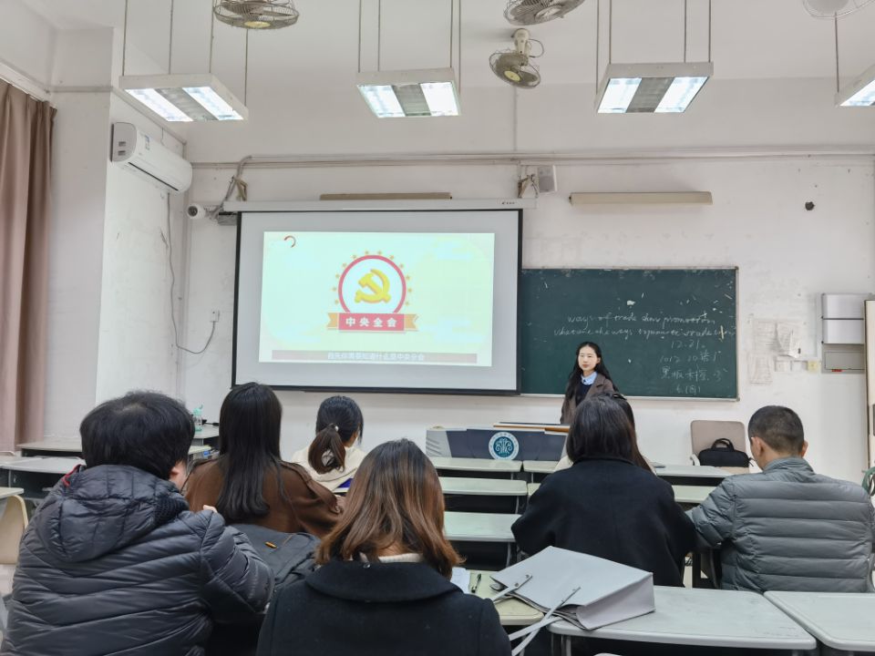 由程妍老师主持12月份理论学习,她首先领着全体党员进行十九届六中全会专题学习,并对习近平在中共中央政治局第三十四次集体学习时的重要讲话精神、省第十一次党代会精神和《习近平:坚持用马克思主义及其中国化创新理论武装全党》进行专题学习和研讨。