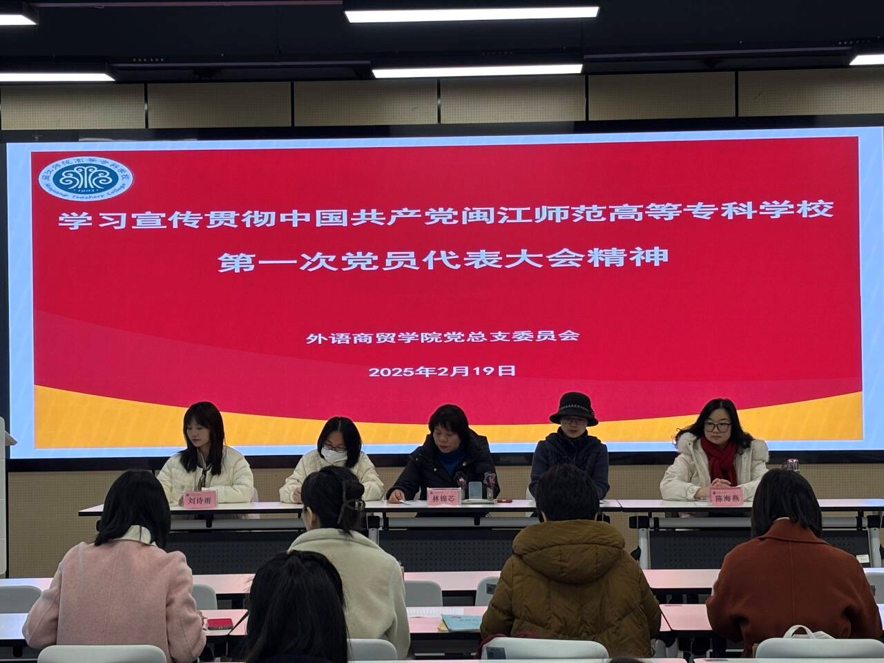 2025年2月19日下午,外语商贸党总支学习宣传贯彻中共大赢家体育app下载委员会第一次党员代表大会精神,学院全体党员和群众代表参加本次学习,会议由党总支书记林锦芯主持。