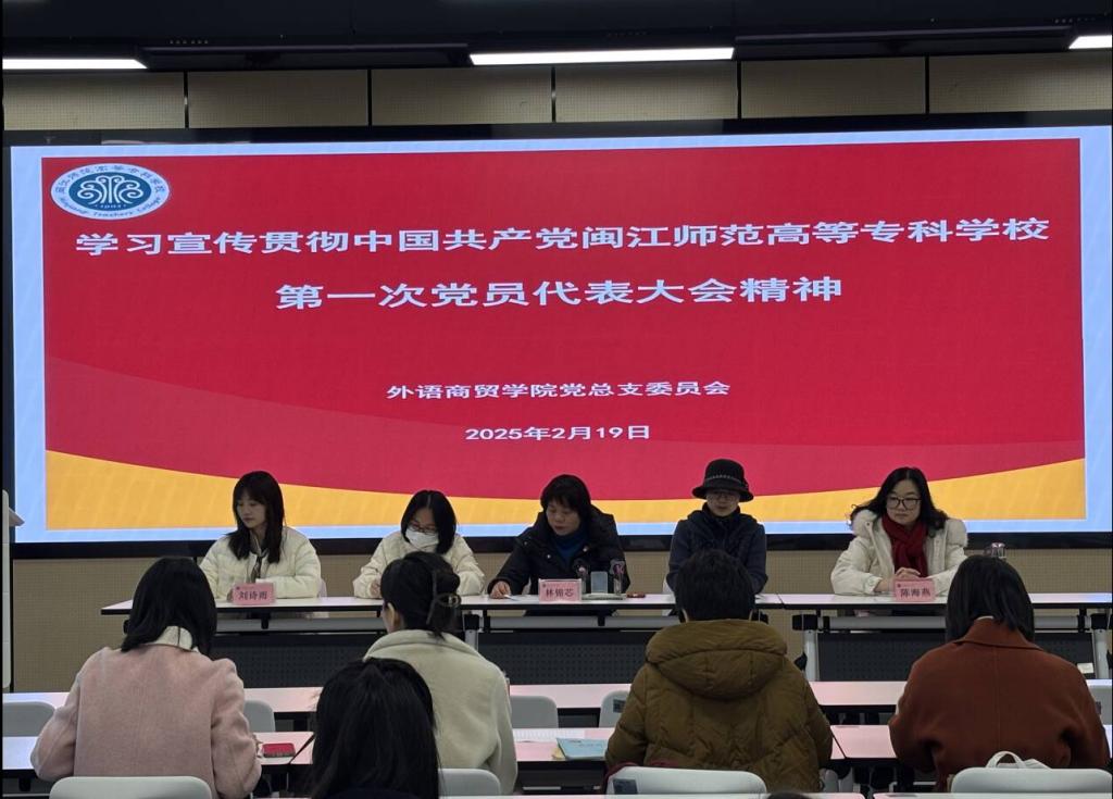 2025年2月19日下午,外语商贸学院党总支学习宣传贯彻中国共产党大赢家体育app下载委员会第一次党员代表大会精神,学院全体党员和群众代表参加本次学习,会议由党总支书记林锦芯主持。
