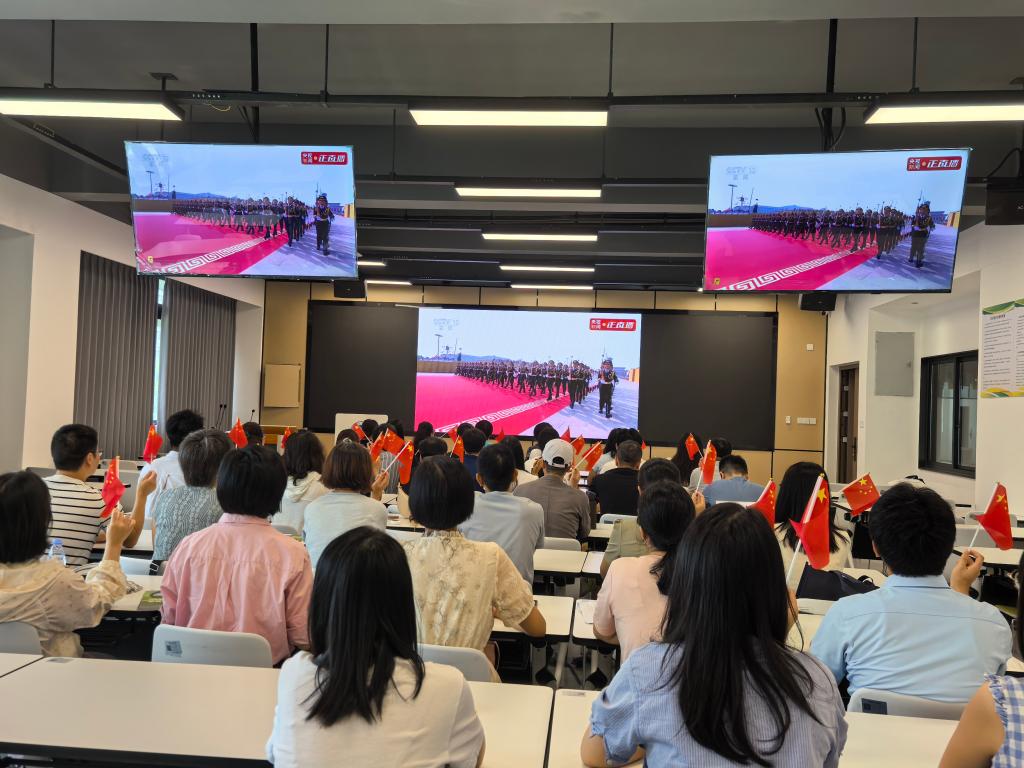 2025年9月3日上午,外语商贸学院组织全体教职工及在校学生党员齐聚产创楼307,共同收看纪念中国人民抗日战争暨世界反法西斯战争胜利80周年大会及阅兵仪式现场直播。活动通过“历史回眸+现实观照”的双重视角,引导师生铭记历史、致敬英雄,并从中汲取奋进力量。