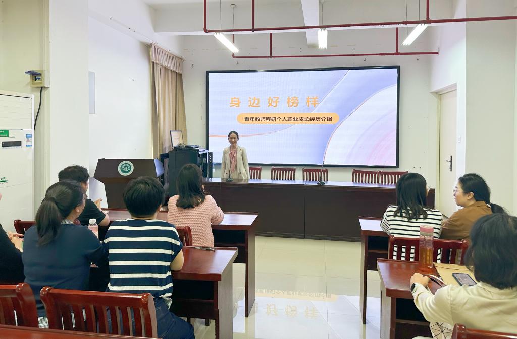 活动上,优秀青年教师程妍首先对自己做了简单介绍,回顾了自己的职业成长经历。自入职10年以来,她扎根教学教研工作,在教学改革、提高教学质量方面取得不错的成绩。曾参与省级重点课题1项,省级课程思政示范课程2项(《大学英语》、《英语阅读》),与课程教师和课程团队被认定为课程思政教学名师及团队,主持和参与校级课题各1项。曾获得各级各类教学类奖项总计19项,其中国家级和省部级各6项;曾指导学生获省级奖项7项。