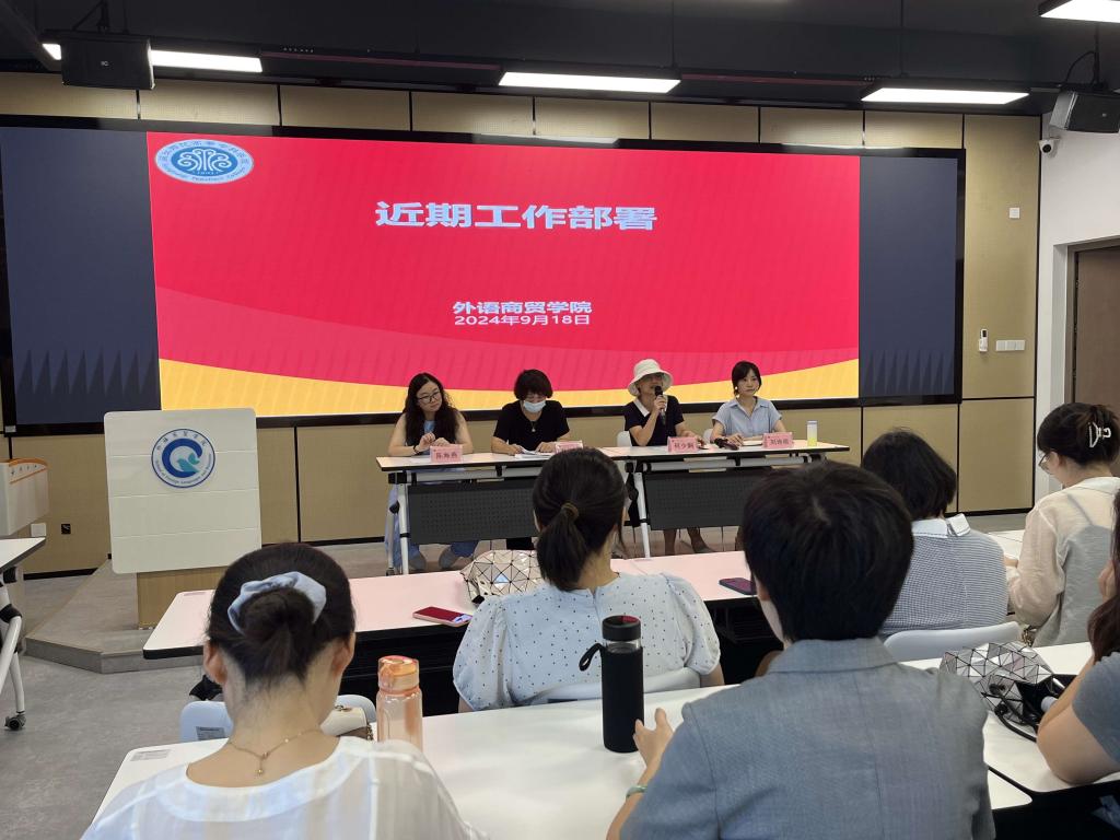 2024年9月18日下午,外语商贸学院在产创楼307多功能报告厅举行了例行会议。学院党总支书记林锦芯、院长何少娴、副院长陈海燕、副院长刘诗雨以及全体教职工出席了会议。会议由何少娴院长主持。