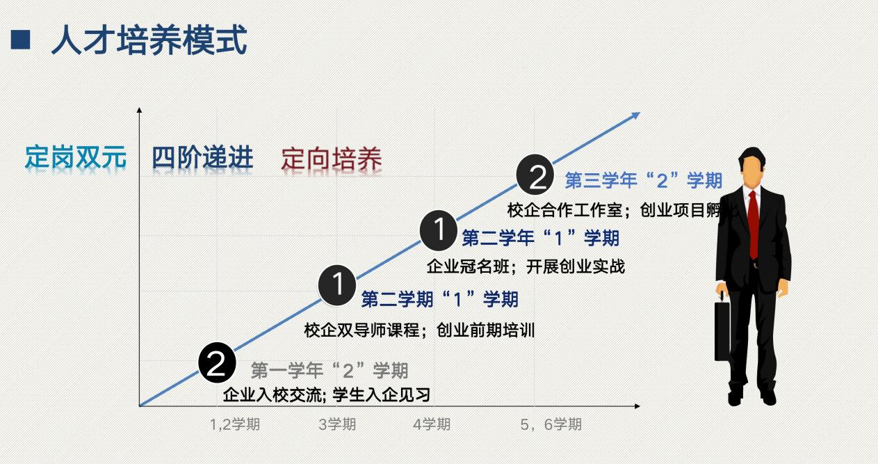 依托省级现代学徒制项目和福建省产教融合示范专业点项目的建设,采用“定岗双元、四阶递进、定向培养”人才培养模式,寻找对口企业,定向企业工作岗位,学校企业双元主体,学生学徒双重身份,过程培养采用“2+1+1+2”四阶递进,定向为同类企业相似岗位培养人才。