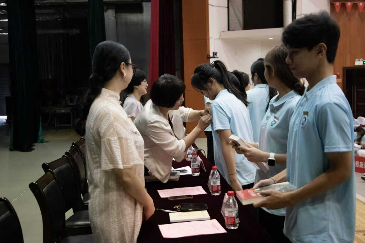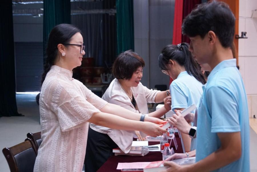 随后,学院领导为8位新生代表郑重佩戴校徽,并赠送《习近平在福州》一书。当全场新生整齐地戴上校徽,胸前的徽章在灯光下熠熠生辉,整个环节庄重而富有仪式感。这一枚枚校徽的佩戴,不仅标志着新生们正式成为闽江师专大家庭的一员,更寄望各位新同学能将“养浩然气、广仁爱心”的校训深植心田,化作砥砺前行的力量,让这份精神在日常言行中自然流露,真正做到内化于心、外化于行。