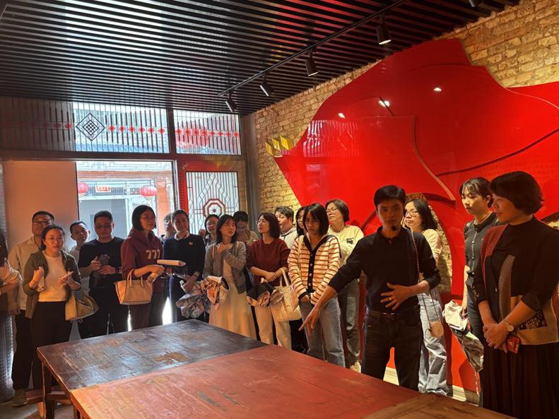 在官圳村,党员教师们一起参观了官圳里园,作为乡村振兴打造"一村一品"背景的产物,官圳里园以600多年的榕树群为核心,以"陶瓷文创+农业+生活方式"的理念形成,引入"非遗+"的工坊形式,以宋代元素打造"官圳里.文化展示中心"、“官圳里.古榕园”"官圳里.艺术生态农场"、"官圳里.宿"等四大板块且带动周边众多体验式工坊的打造,是—个集文化艺术、匠心工坊、教育研学、民俗文化、休闲农业于一体的交流平台。学院党总支书记林锦芯、院长何少娴、副院长陈海燕与园区负责人、校友会副会长刘榕彬围绕学院人才培养,对接大学生就业,跨境电商助力企业拓展海外市场等进行探讨交流,访企拓岗。