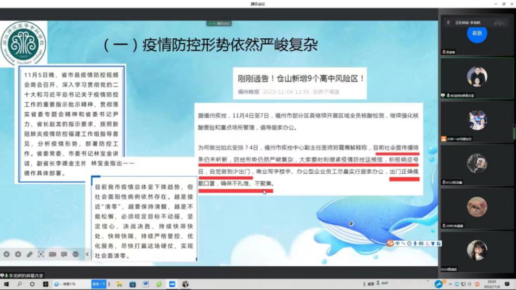 做好宣传引导,传递战“疫”信心。学生党支部每位成员的朋友圈、QQ群都是一个疫情防控宣传站,在做好自身知疫防疫的同时,利用新媒体平台及时转发、宣传最新防控进展,统一思想认识。此外,支部党员教师还利用网络新媒体新技术,召开特色线上晚点名,及时传达学校各项工作部署、防控工作要点;组织学生学习掌握疫情防控知识、熟悉防控重点;落实“日报告、零报告”制度,建立“一生一档”,每日与学生密切联系,确保学生身体健康和疫情防控措施到位。