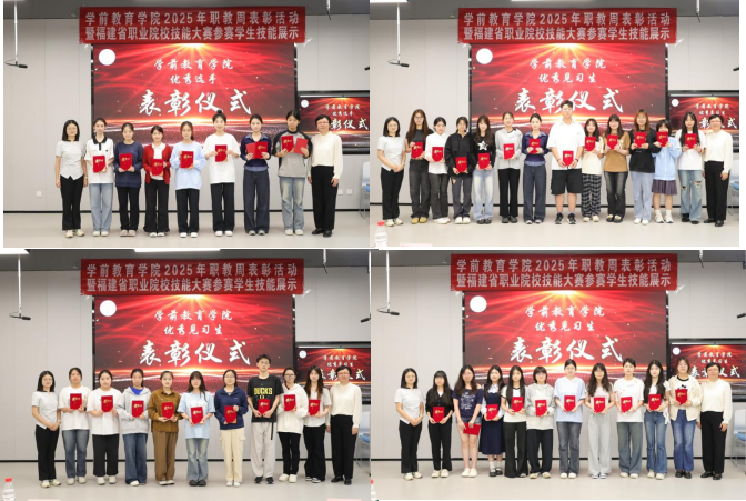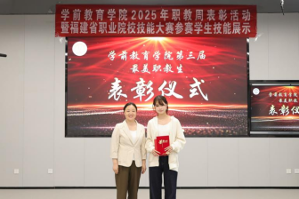 为弘扬职业教育精神,表彰优秀学生,激励全体学生奋发进取,5月28下午,学前教育学院以线上线下相结合的形式在旗山校区成功举办2025年职教周表彰仪式暨福建省职业院校技能竞赛参赛学生技能展示活动。学院学前教育、早期教育和婴幼儿托育服务与管理3个专业34个班级的学生通过网络直播的形式观看了本次活动。学院书记林冉,院长林毓君,副院长王丹丹,副书记杨美玲,综合科科长郭剑恩,艺术教研室主任纪益波,理论教研室主任胡慧娟以及学院师生代表参加活动。仪式由学院早教教研室主任华洁琼主持。