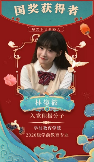 林鋆筱,女,汉族,入党积极分子,出生于2002年6月,学前教育学院20级学前教育7班学生,国家奖学金获得者,现担任20级学前教育7班副班长一职。