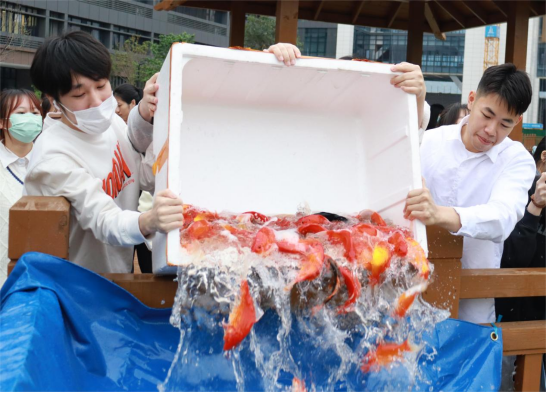 锦鲤象征着富贵、吉祥、健康和幸福。这不仅是毕业生们对未来生活的向往,也是对母校的美好祝愿。活动中,工作人员把一袋袋装着锦鲤的袋子倒进泡沫箱。在工作人员的指导下,毕业生学生代表们与校领导一同缓缓地将锦鲤们倒进冰心湖中。同学们边放边高呼“学前教育学院毕业快乐!”这其中蕴含着对母校的美好祝愿与对未来锦绣前程的憧憬。
