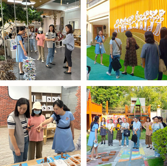 吴敏园长对高研班园长们来园观摩学习表示热烈欢迎,并针对园所及幼教集团成立背景、办园理念、园部环境、特色课程建设等方面做了详细介绍。随后高研班园长们分别三组,分别从硬件环境、游戏环境、心理环境等方面,参观解读了教室、走廊、操场及多功能室的环境创设,感受我园以环境创设为抓手,实施渗透式美育的教学理念和措施:通过打造“转角遇见美”“一步一景”的环境,将课程理念的顶层设计与环境互动充分对话,赋予儿童学习更深层次的涵义。我园的美育环境建设让高研班园长们受益匪浅,点头称赞,纷纷掏出手机拍下优秀的环境创设和教学教具作为参考资料。