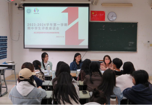 为了更好帮助和引导各班学习委员树立学生干部责任意识,明确工作职责,加快推进学院先进班集体建设与优良学风建设,学前教育学院于2023年11月14日中午在教学楼1003教室召开了“2023-2024学年度第一学期学前教育学院期中学生”座谈会。本次座谈会由综合科系秘廖心妍老师主持。学前教育学院副院长陈闽光,学院团委学生会学习部成员、22级、23级各班学委参加此次座谈会。