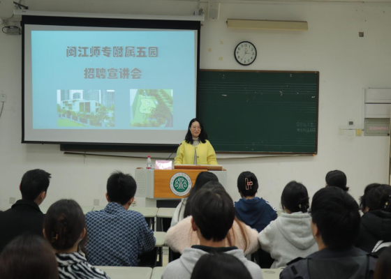 宣讲会开始,王晶老师简要地向毕业生们介绍了闽师专第五附属幼儿园的建园位置和目前建园进展情况。接着,王晶老师向大家介绍了幼儿园校园环境、课程建设、后勤管理、卫生防疫等重点内容,闽师专第五附属幼儿园同其他附属园的不同之处在于:该园根据未来学前教育发展需求,坚持贴合国家政策,专注服务于0-6岁的孩子,致力于营造多元智慧的育人环境,打造托育一体化幼儿园,让2024届毕业班学生较全面了解附属幼儿园工作开展情况。不仅如此,王晶老师还强调其办园理念是“初禾为育,禾立生长”,是用爱、用心培育“娇嫩的禾苗”,让孩子茁壮成长为独当一面的“栋梁”。最后,王晶老师提出了闽师专附属第五幼儿园人才招聘的计划和需求,也对毕业班学生共同关注的岗位要求、薪资待遇等问题作出详细解答,且希望毕业班学生在幼儿园家长沟通能力方面得以提升,同时期待学前教育学院2024届优秀毕业生们加入闽师专附属第五幼儿园的大家庭。