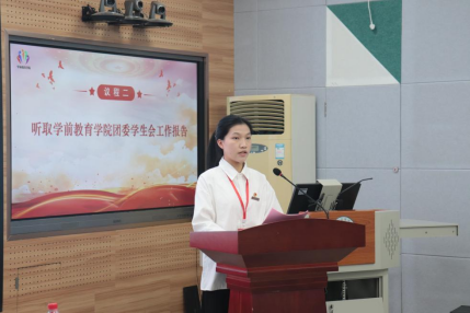 丘苏兰代表学前教育学院学生作工作报告。报告从加强思想政治引领,打造特色品牌活动,搭建网络新媒体矩阵,深化组织体系改革,四个方面回顾了学前教育团委学生会过去的工作,并表示学前教育学院团委学生会将认真学习贯彻习近平新时代中国特色社会主义思想和党的二十大精神,积极开展各项工作,为学生的全面发展和校园文化建设做出更大奉献。