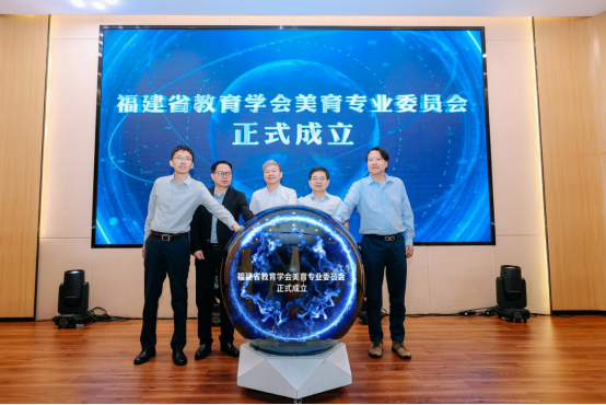 陈明庆会长、林子波书记、林伟川校长、吴明洪秘书长、胡泊理事长共同启动水晶球,与参会领导嘉宾共同见证福建省教育学会美育专业委员会的正式成立。