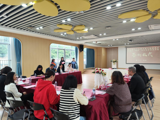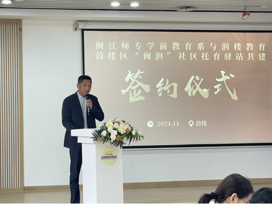 为了进一步加强校企合作,切实提升学生理实一体的培养质量,11月22日,学前教育系与鼓楼国投润楼教育集团在旗汛口幼儿教育集团软件园教学点进行了鼓楼区“闽润”社区托育驿站共建签约仪式。学前教育系党委书记林冉、主任林毓君等党政领导班子成员,润楼教育集团董事长马文亮、总经理林琳等项目负责同志出席了签约仪式。