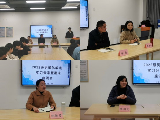 新年伊始,为期两个月的集中教育实习落下帷幕。为全面了解2022级弘毅班全体男师们的实习情况、实习成果及未来规划。1月8日下午,学前教育学院于产创楼402开展22级男师“弘毅”班实习分享会暨期末座谈会。本次座谈会由班导师陈鹤主持;学前教育学院党委书记林冉、院长林毓君、副院长陈闽光、王丹丹出席;22级全体男生共同参与。
