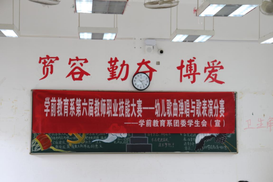20214月26日至4月30日,学前教育系团委学生会在教学楼开展了第六届教师职业技能大赛幼儿歌曲弹唱与歌表演初赛。本次比赛由朱诗雅老师、陈鹤老师、黄靖喻老师、林雨晗老师、赵红阳老师、林秀玲老师、夏舒波老师、周晶老师担任评委,我系17级五年专、19级全体同学以及18级五年专、20级部分同学参与本次比赛。