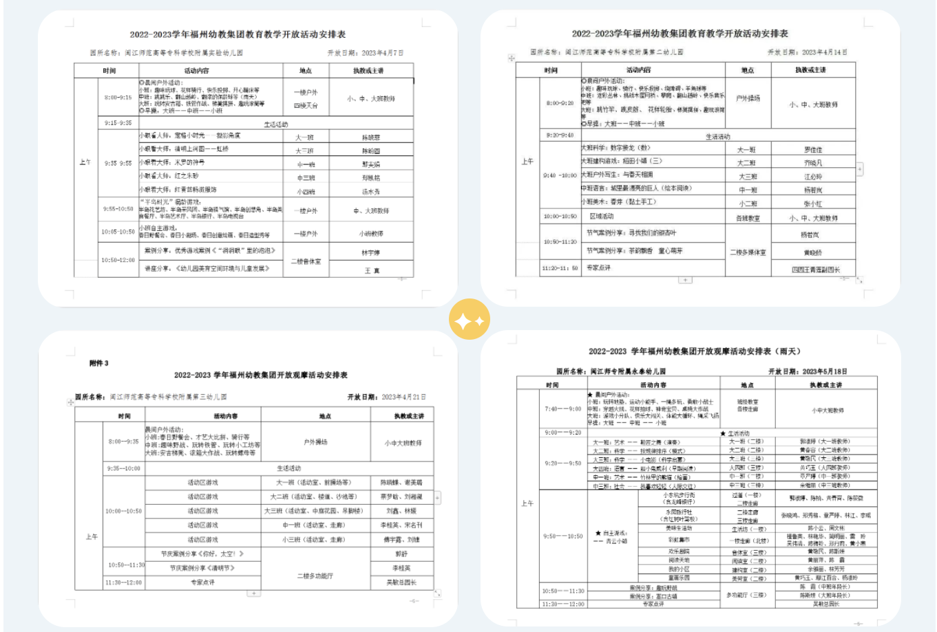 各园详细制定《2022-2023学年福州幼教集团开放观摩活动安排表》并组织实施,通过观摩游戏、教学活动、环境创设,定点跟班观察半日保教活动、案例分享、教学研讨等活动,充分展示了在集团民主平等、双向互动、互利共生的“和”文化架构下,各园积极探索自身园本文化的优质成果,为各园观摩教师带来了丰富的教学盛宴。