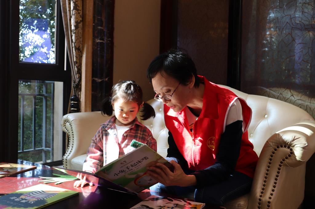 在绘本阅读区域,志愿者提前准备好符合幼儿的年龄特征、贴近幼儿生活经验的绘本,邀请社区的小朋友们一起阅读绘本故事。首先,志愿者们引导小朋友们注意观察绘本上的图片,让他们大胆猜想画面情节,然后鼓励他们用简短的语言讲述自己想象的画面,共同感受绘本故事带来的快乐。绘本阅读区域时不时传来小朋友的笑声,现场其乐融融。