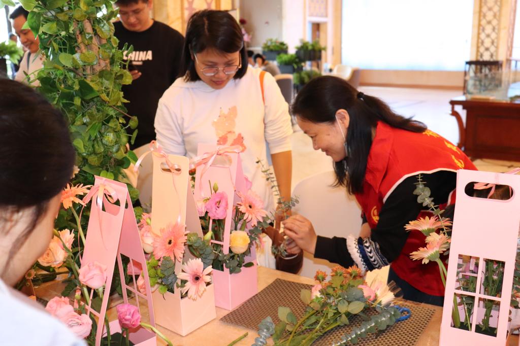 在小花篮制作现场,小朋友们围坐在摆放好鲜花的桌子旁边,认真听志愿者们介绍不同种类的花以及插花的基本步骤,随后在志愿者的鼓励下,开始尝试把自己喜欢的花朵插在花篮中。