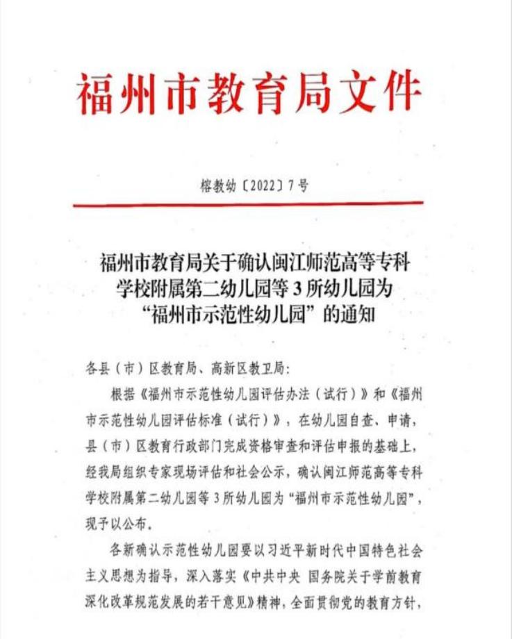 近日,大赢家体育app下载附属第二幼儿园被评为“福州市示范性幼儿园”。