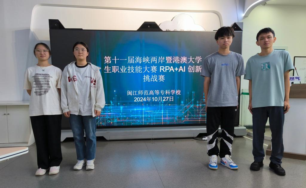 由福建省教育厅、省人力资源和社会保障厅、省互联网信息办公室等主办的第十一届海峡两岸暨港澳大学生职业技能大赛RPA+AI创新挑战赛于10月27日举行线上比赛。由我院李彬雅、李翔宇两位老师指导,黄荣海、李晓彤、易宇佳、林宏跃四位同学组成的参赛团队获得团体三等奖。