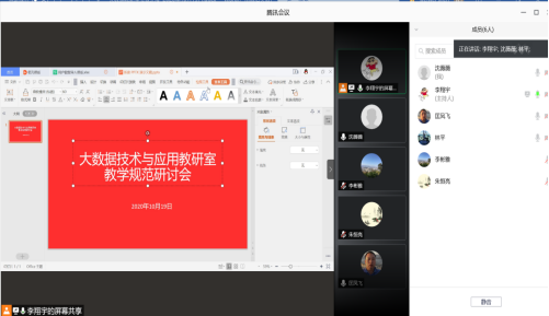 为了促进大数据技术与应用专业建设,规范教师课堂教学,提升教师教学技能,10月19日晚,我系大数据技术与应用专业教研室召开线上全体教师会议,就课堂规范、教学技能展开讨论与经验分享。