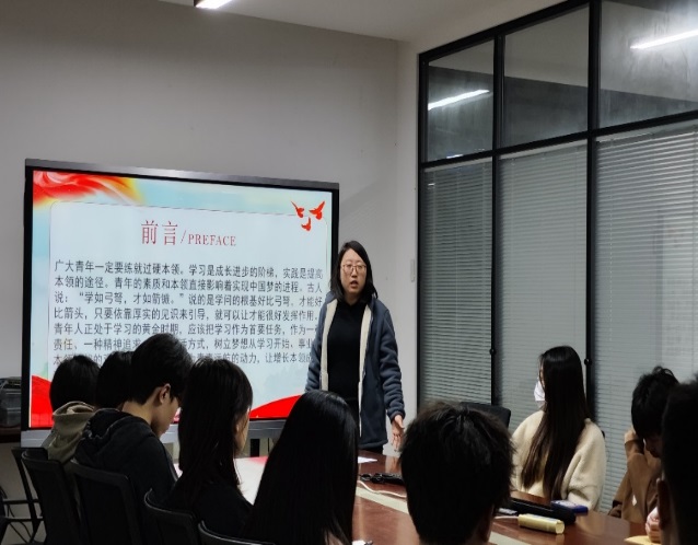 党支部书记李晶晶紧密结合自身和学生实际,运用生动的案例和形象的语言,将习近平总书记关于勤学苦练的重要论述进行了深入浅出的讲解,鼓励同学们要保持初生牛犊不怕虎的劲头,不懂就学,不会就练,一定要练就过硬本领。