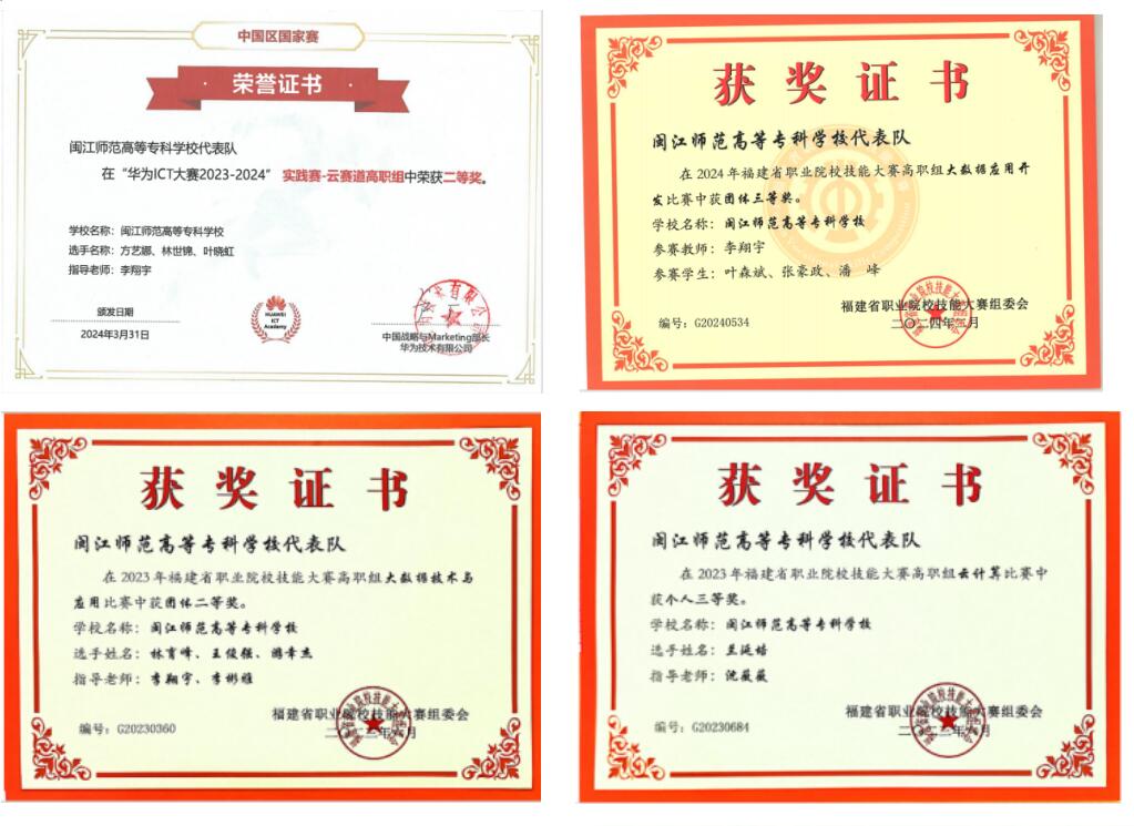 华为ICT大赛2023-2024”福建省实践赛-云赛道高职组特等奖1项、一等奖3项、二等奖4项、三等奖3项;