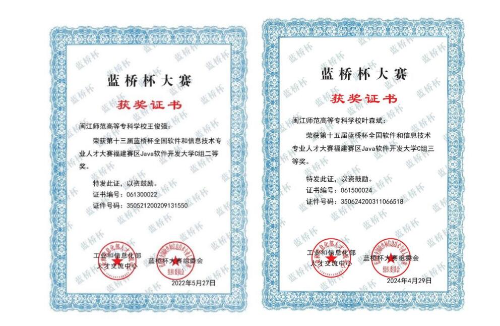 2022年第十三届蓝桥杯全国软件和信息技术专业人才大赛福建赛区Java软件开发大学C组二等奖1项;