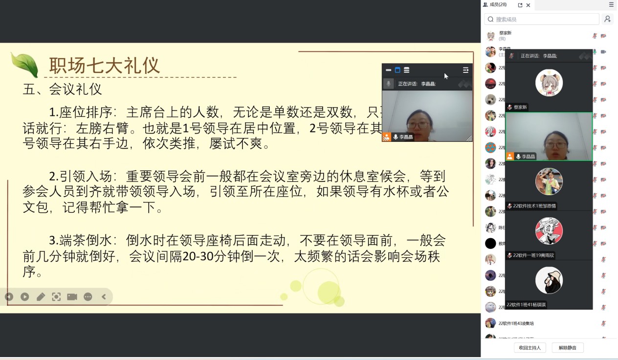 会议的最后,李晶晶老师鼓励学生们积极实践所学的礼仪和沟通技巧,通过不断的实践和反思,提升自己的职场软实力。她强调,良好的沟通能力和礼仪知识是职场成功的关键,希望每位毕业生都能够在职场中展现出自己的风采。