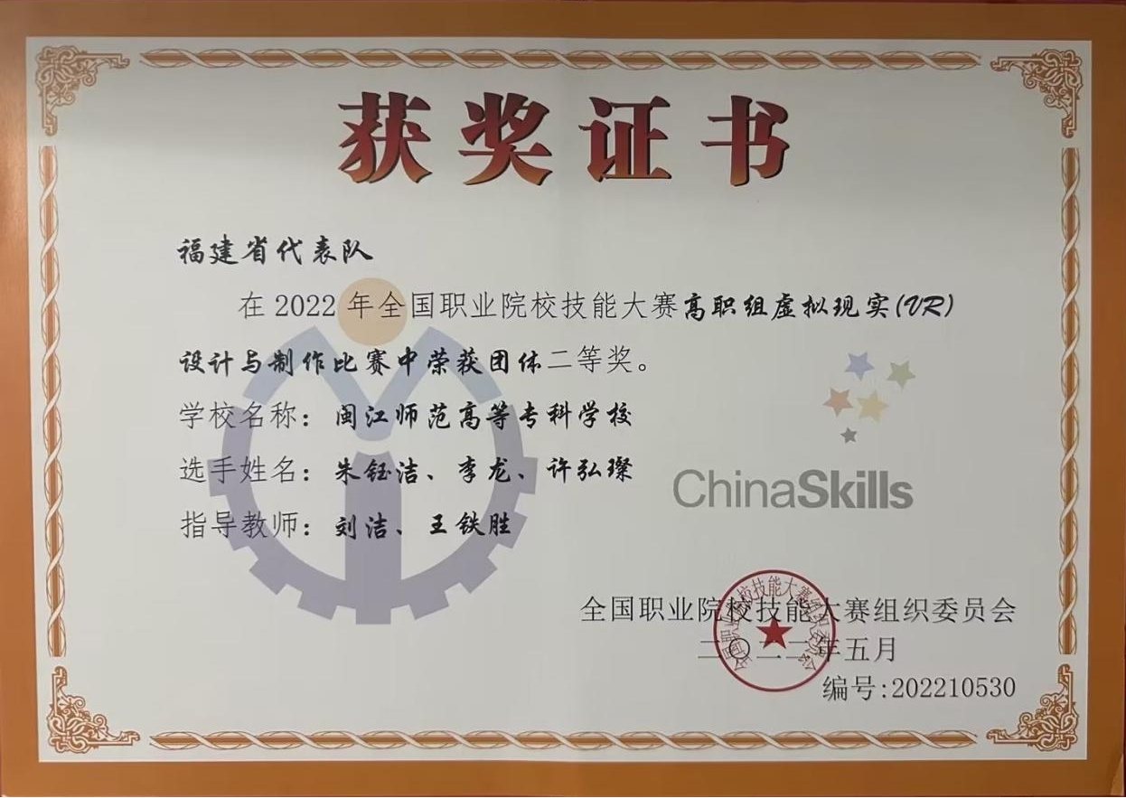 2022年第十届海峡两岸大学生职业技能大赛(高职组)虚拟现实(VR)设计与制作赛项二等奖;
